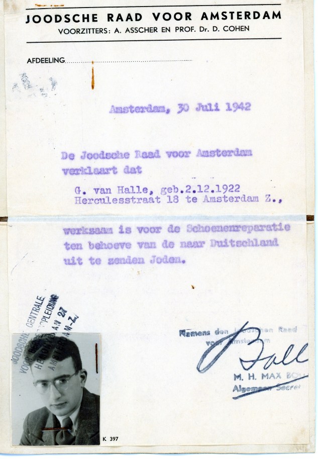 This identification booklet, issued by the Jewish Community in Amsterdam, dictated that my grandfather was employed as a shoemaker for the Jewish community. I believe this was on the documents my grandfather had to perpetually carry around. My grandfather told me that because he was designated as a “shoemaker for the Jewish community” it kept him off the deportation list.